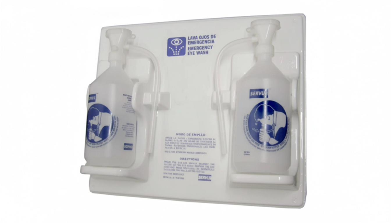 Cada botella tiene rapa para evitar la contaminación, un tubo de pesca que toma agua desde el fondo, una copa que se adapta al globo ocular y un tubo de descargas con válvula que aseguta que el líquido usado no retorne al recipiente y sea expulsado por un costado. (no incluye solución).